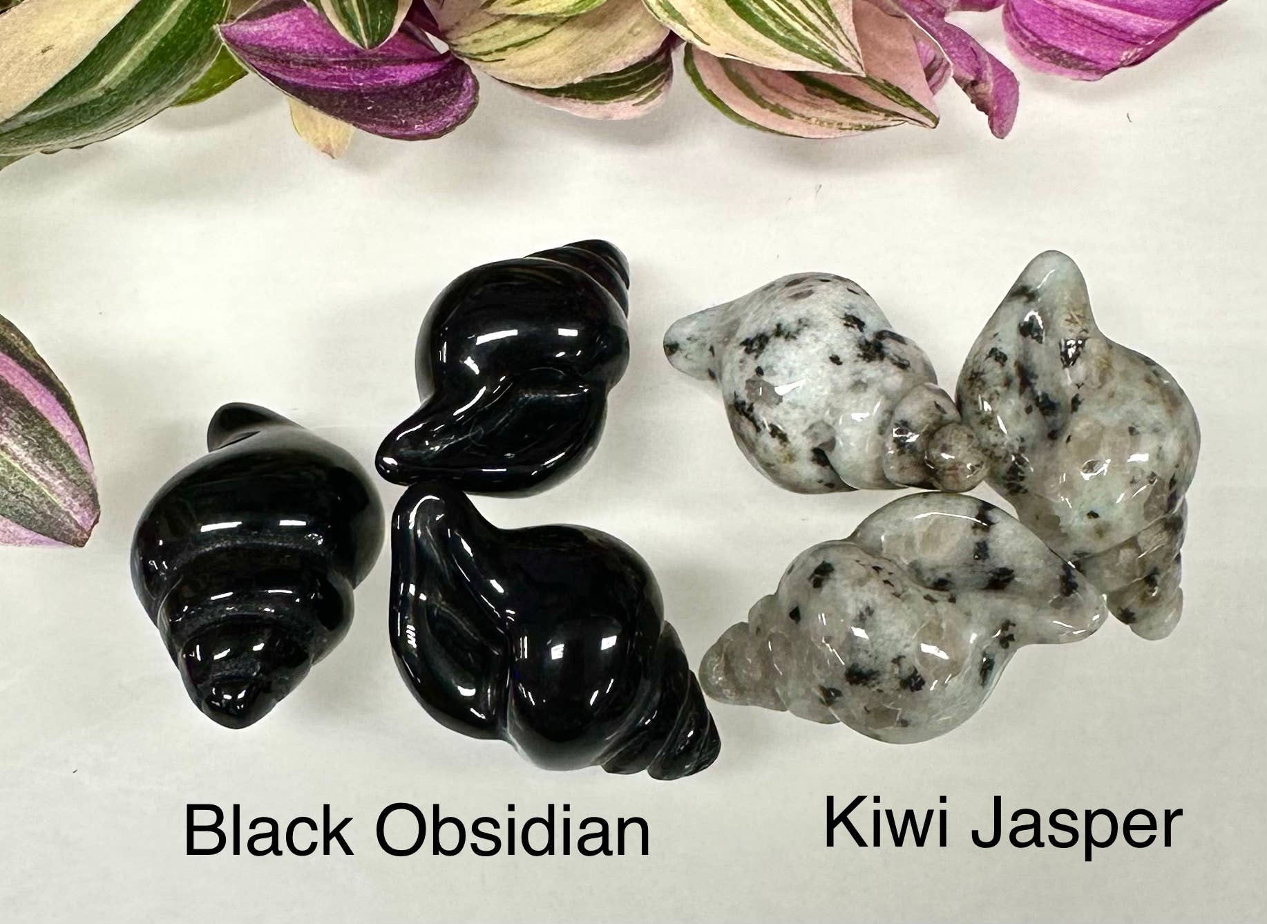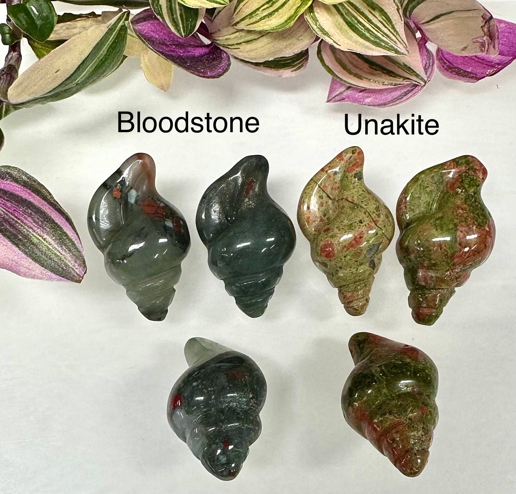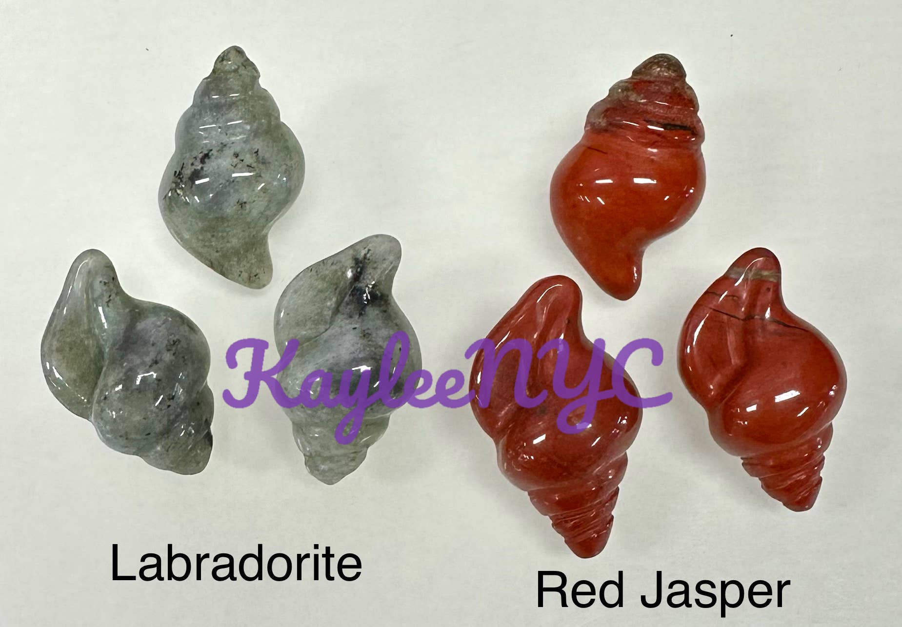 30mm Mixed Crystal Sea Shell. 1 Clear Quartz, 1 Labradorite, 1 Kiwi Jasper, 1 Aventurine, 1 Sodalite, 1 Tiger Eye, 1 Black Obsidian, 1 Rhodonite , 1 Bloodstone, 1 Dragon Bloodstone, 1 Larvikite, 1 Unakite, 1 Howlite, 1 Red Jasper, and 1 Opalite.