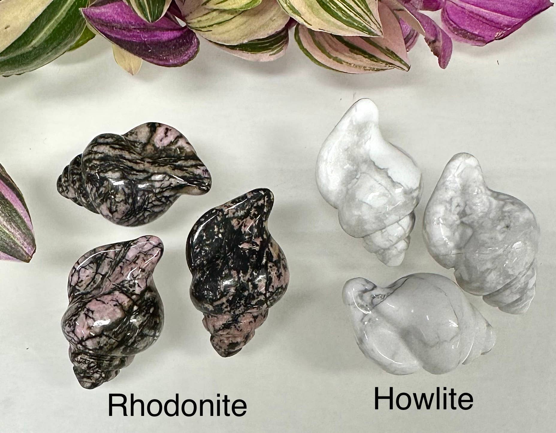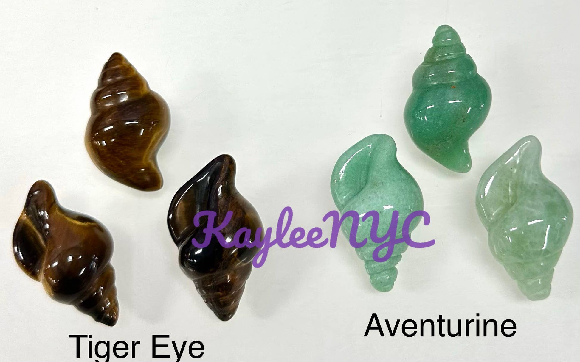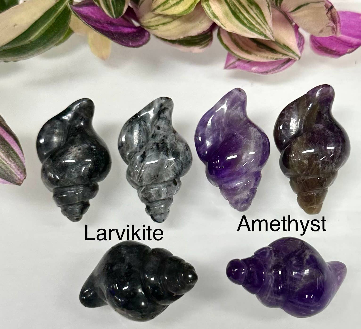 30mm Mixed Crystal Sea Shell. 1 Clear Quartz, 1 Labradorite, 1 Kiwi Jasper, 1 Aventurine, 1 Sodalite, 1 Tiger Eye, 1 Black Obsidian, 1 Rhodonite , 1 Bloodstone, 1 Dragon Bloodstone, 1 Larvikite, 1 Unakite, 1 Howlite, 1 Red Jasper, and 1 Opalite.