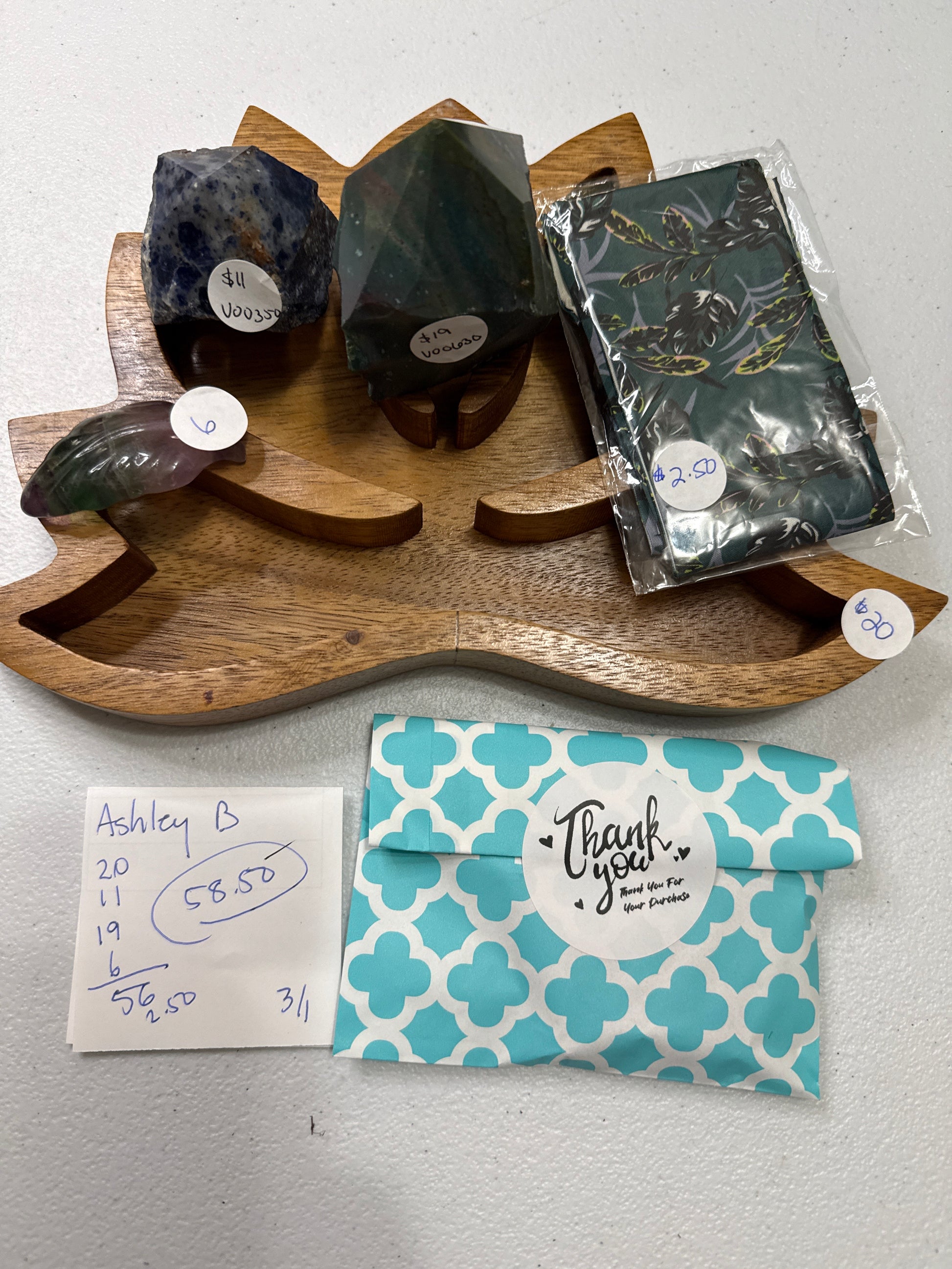 3/1 - Lotus bowl, purse scarf, Ocean Pol. Point, sodalite pol. point, Fluorite leaf