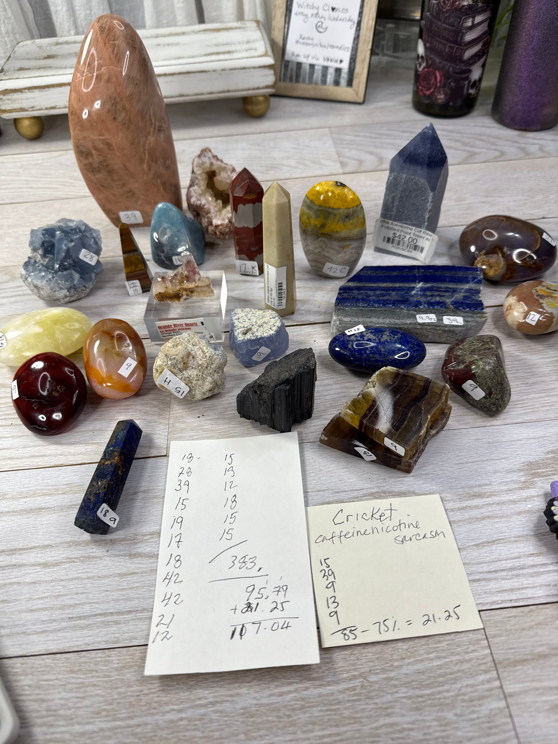 12/28: 2 Carnelian palms, lemon calcite palm, tower malachite azurite, celestite chunk, peach moonstone free form, pink amethyst with calcite, trolleite polished chunk, Tiger iron obelisk, Orange River Quartz, sm celestite chunk, Tourmaline, 2 yellow flourite slabs, lapis lazuli palm, lapis lazuli palm, blue aventurine polished point, Violet agate palm, flower agate palm. Noreen jasper tower, yellow jasper tower, bumblebee jasper dome, dragon skin jasper pc.