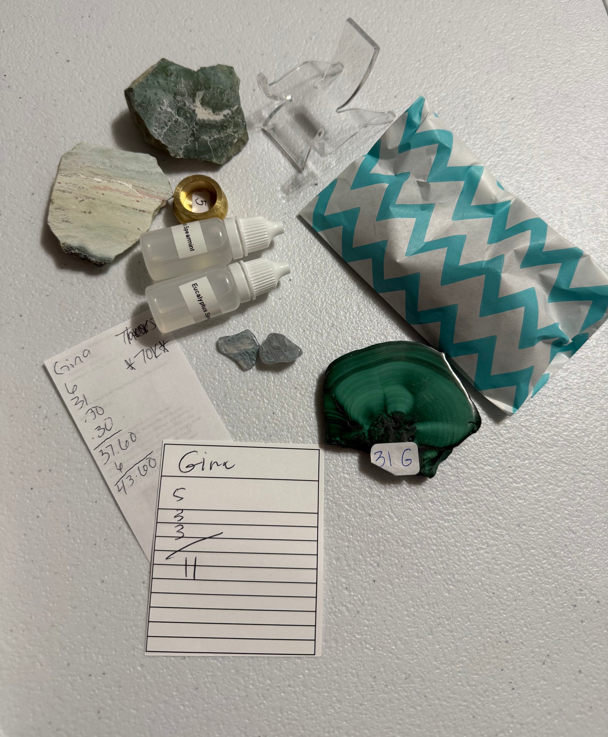 Thurs: 2 pc Indian Turquoise / Green Sardonyx,2 pcs Moss tumbles, Malachite slab w stand