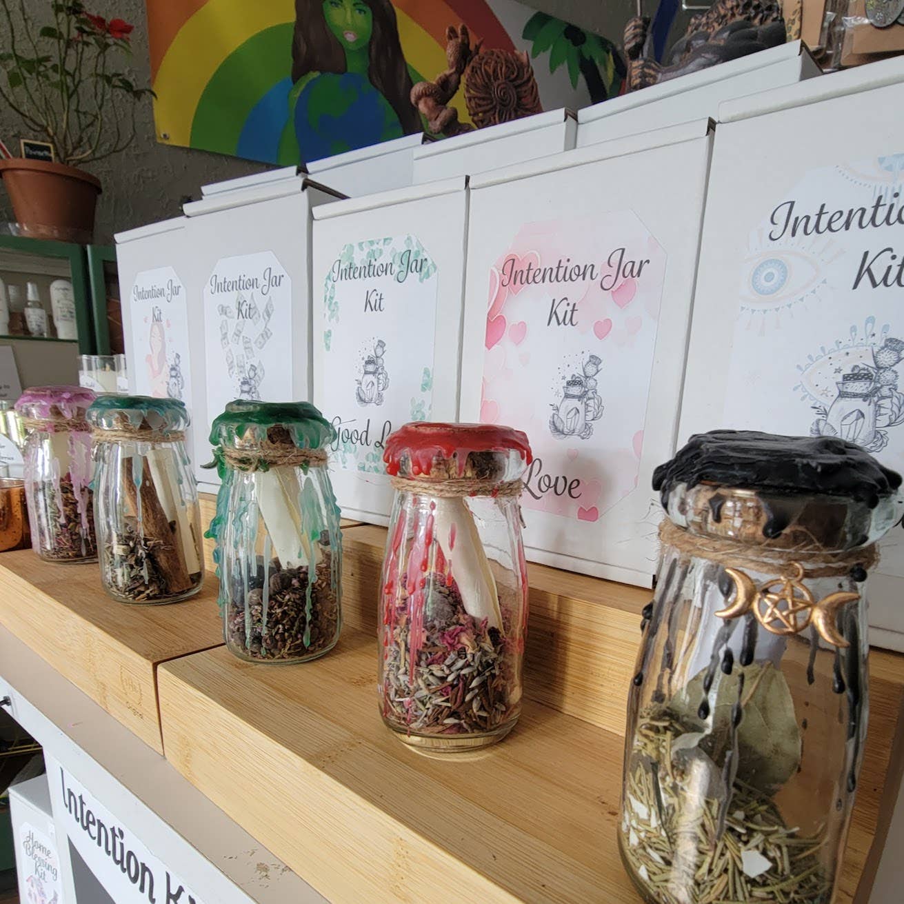 Intention jars are just another tool to help you concentrate your attention on whatever it is you’re seeking. Kit includes: Instructions Jar with cork Paper Three Herbs (Rosemary, Bay Leaf, Egg Shells) One Crystals (Black Tourmaline) Black Chime Candle to seal jar with Black tealight candle for meditation Charm Twine One incense cone This kit comes with all the items listed above to build your jar. The picture is what your finished intention jar will look like. Charms will vary.
