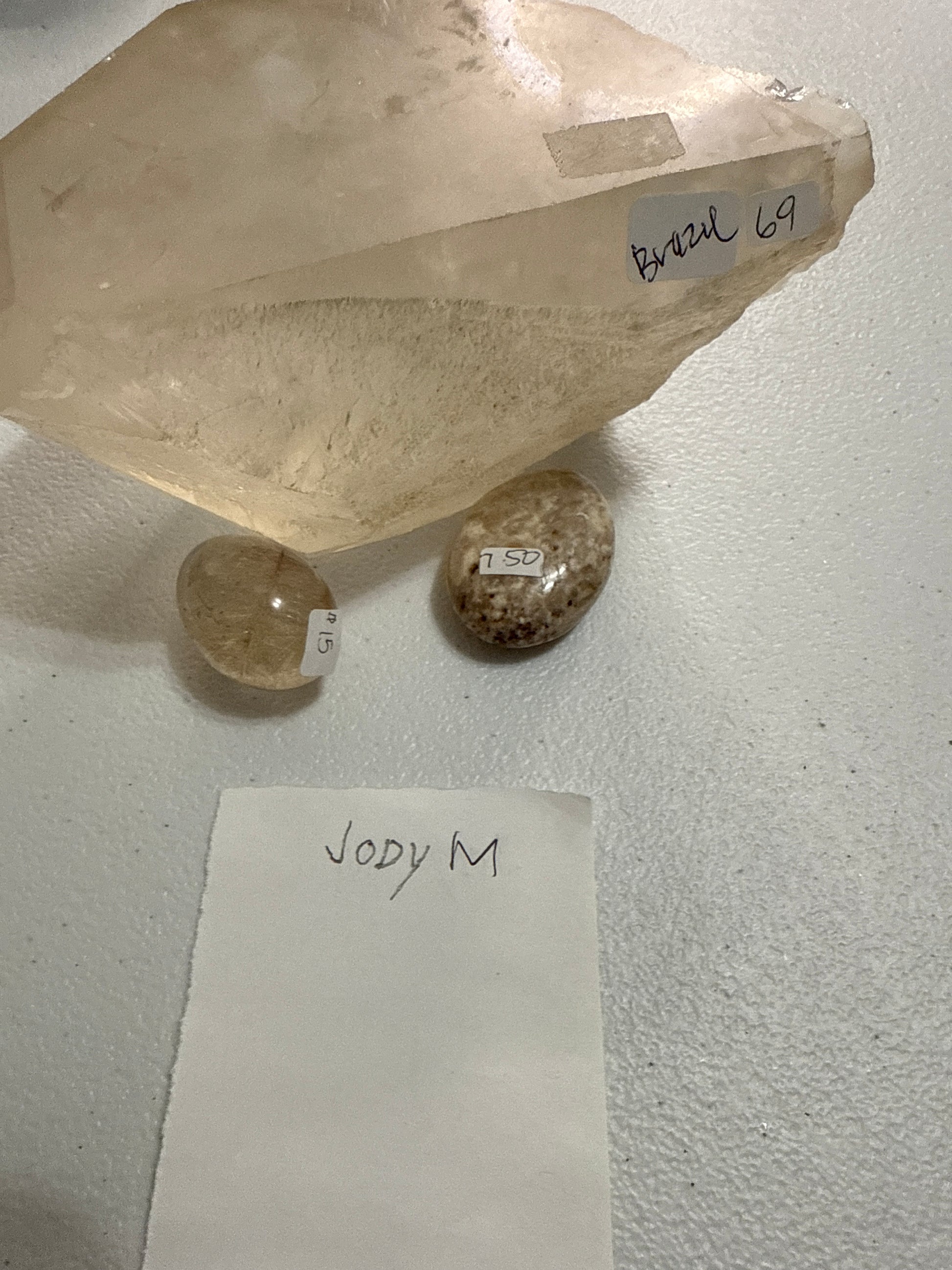 12/14: Rutile egg, Cappucino Opal palm, Large brazilian quartz point $91.50 - 50% = $45.75