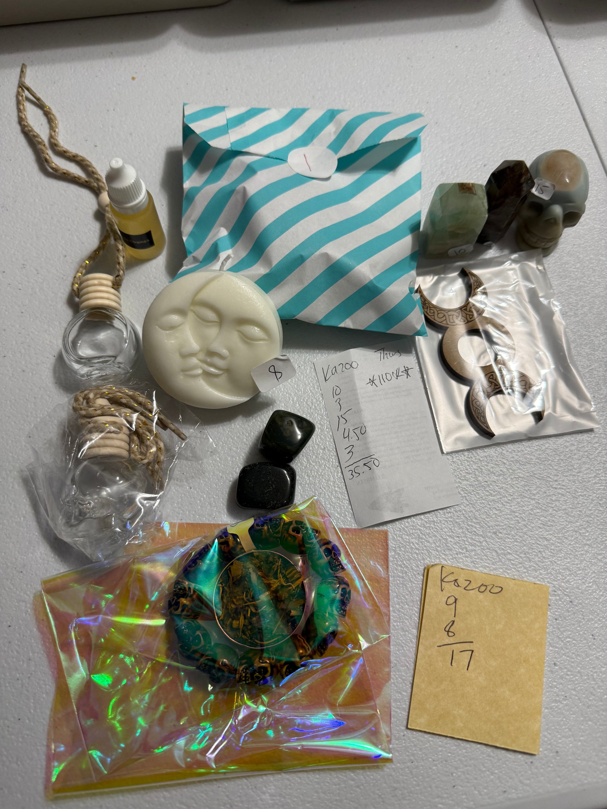 Tues: skull diffuser, circle diffuser, nag champa fragrance, round moon candle