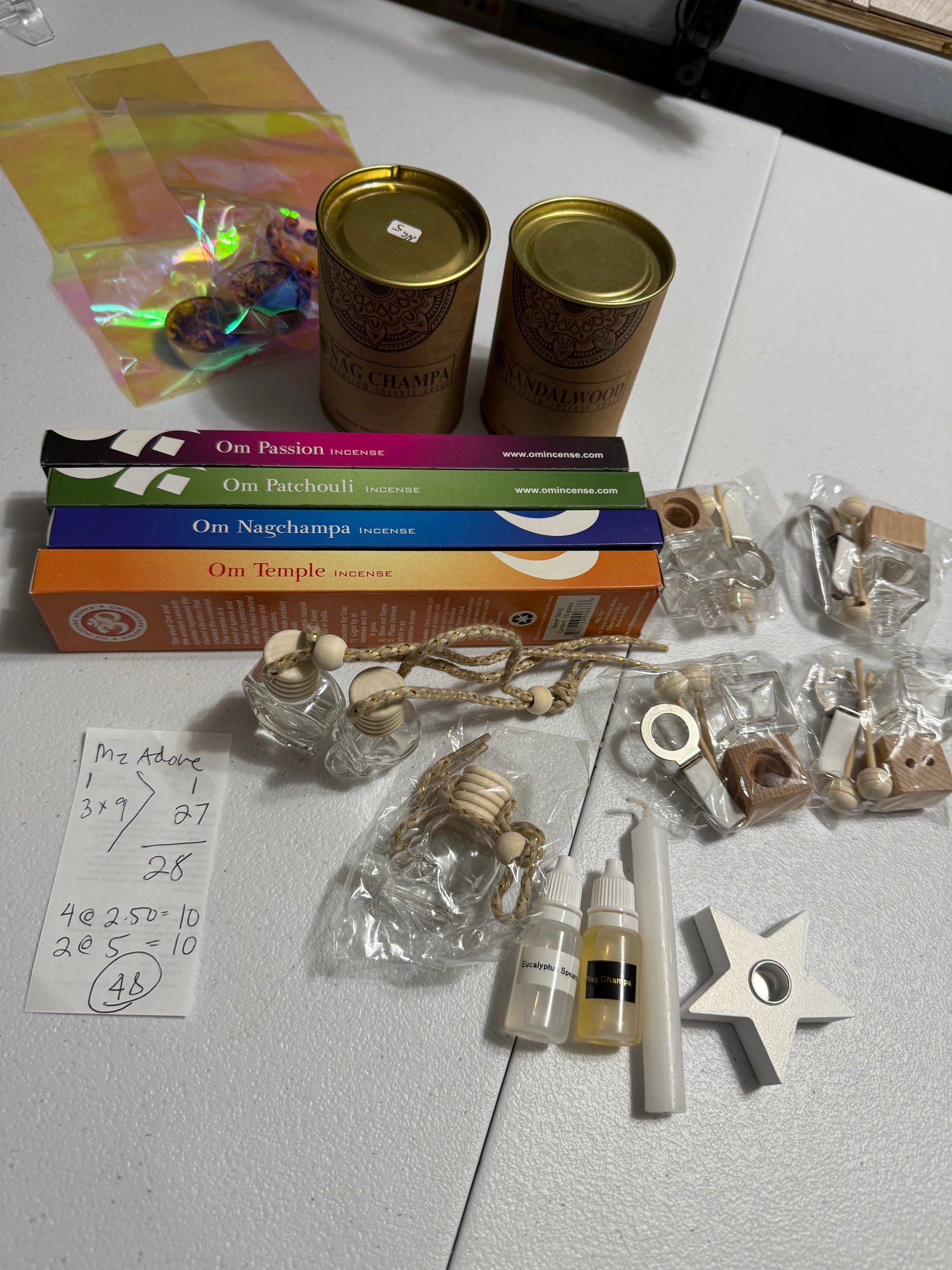 Tues: 4 stick incense, 2 backflow, 7 diffuser, 2 fragrance, 1 chime candle